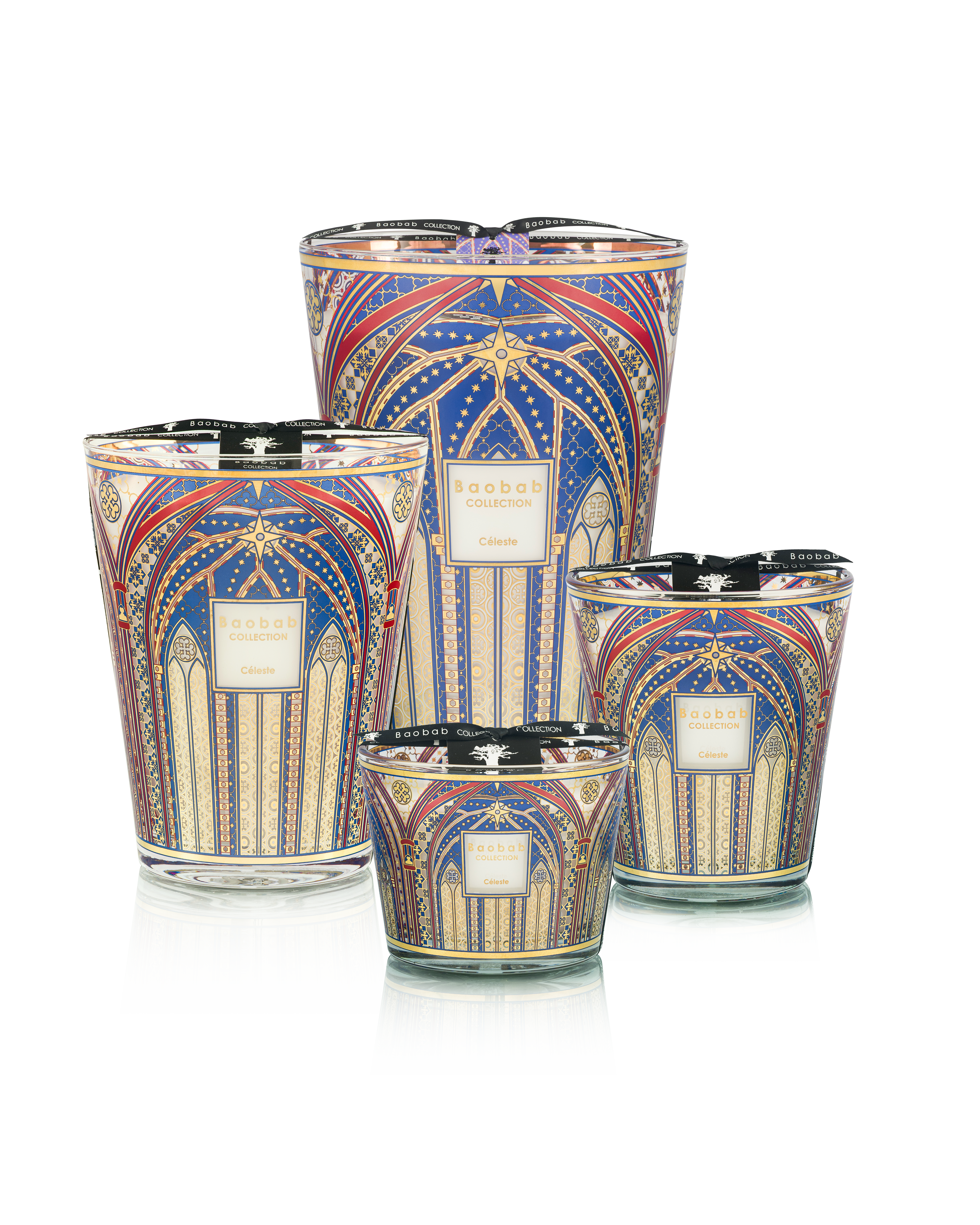 La bougie parfumée Céleste de Baobab Collection est décorée d’une sérigraphie en or 24 carats et d’un bleu profond, rappelant l’architecture de la voûte céleste de la cathédrale de Cracovie. Le dessin est une interprétation de la nef : un plafond en ogives, peint sur fond bleu et parsemé de petites étoiles dorées. Le décor se place autour du verre comme des portes imaginaires ouvrant vers le ciel. La flamme anime le décor et laisse imaginer une rêverie, nous emportant dans un désir de connexion spirituelle.