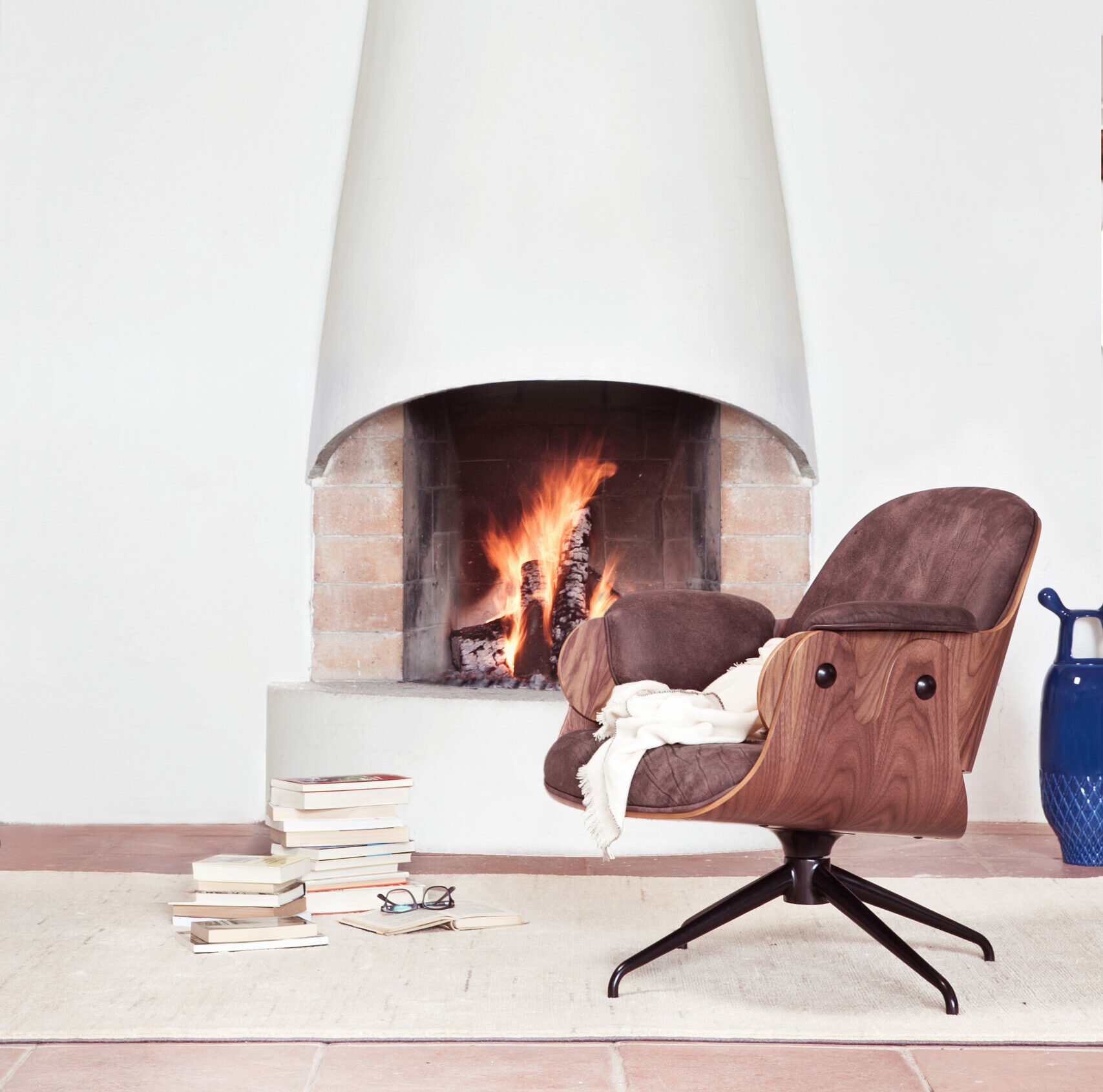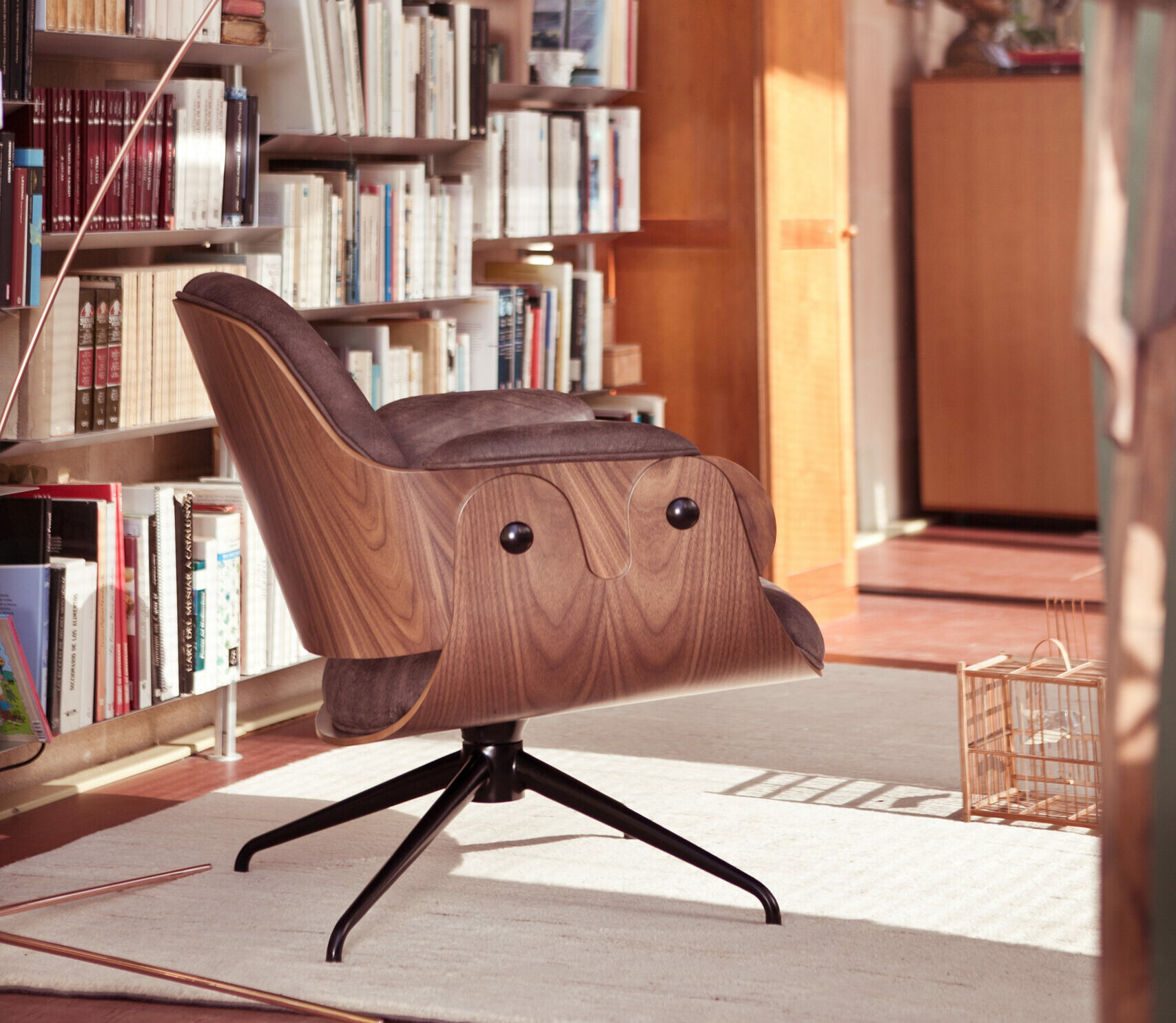 Le fauteuil repose sur une base en aluminium coulé avec des pieds en acier tubulaire poudré, assurant robustesse et longévité. L’assise et le dossier sont plaqués en bois de hêtre avec finitions noyer, frêne naturel ou frêne teinté noir. Le revêtement peut être choisi parmi une gamme de cuirs et tissus haut de gamme. Un repose-pieds assorti est disponible pour prolonger l’expérience de confort.