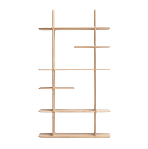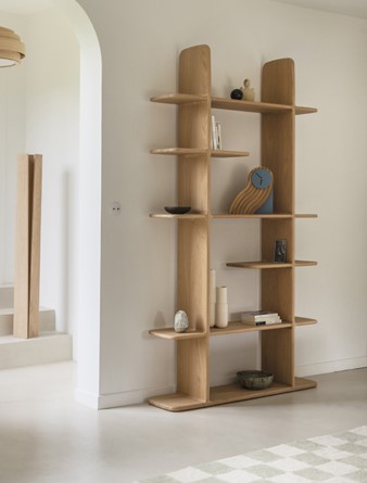 Cette bibliothèque associe beauté et fonctionnalité : elle magnifie livres et objets par ses étagères asymétriques graphiques, tout en restant stable et élégante. Son design organique la rend aussi harmonieuse dans une entrée que dans un salon ou un bureau