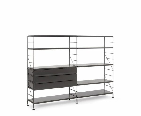 Le système TRIA se distingue par sa capacité à s'intégrer parfaitement dans n'importe quel environnement, qu'il soit domestique ou public. Grâce à ses éléments modulaires et ses accessoires variés, il est possible de créer une infinité de configurations adaptées aux spécificités de chaque pièce. Que ce soit pour un salon, une bibliothèque, une chambre ou un bureau, TRIA propose une solution de rangement personnalisée qui répond à des besoins fonctionnels tout en apportant une touche de légèreté visuelle.