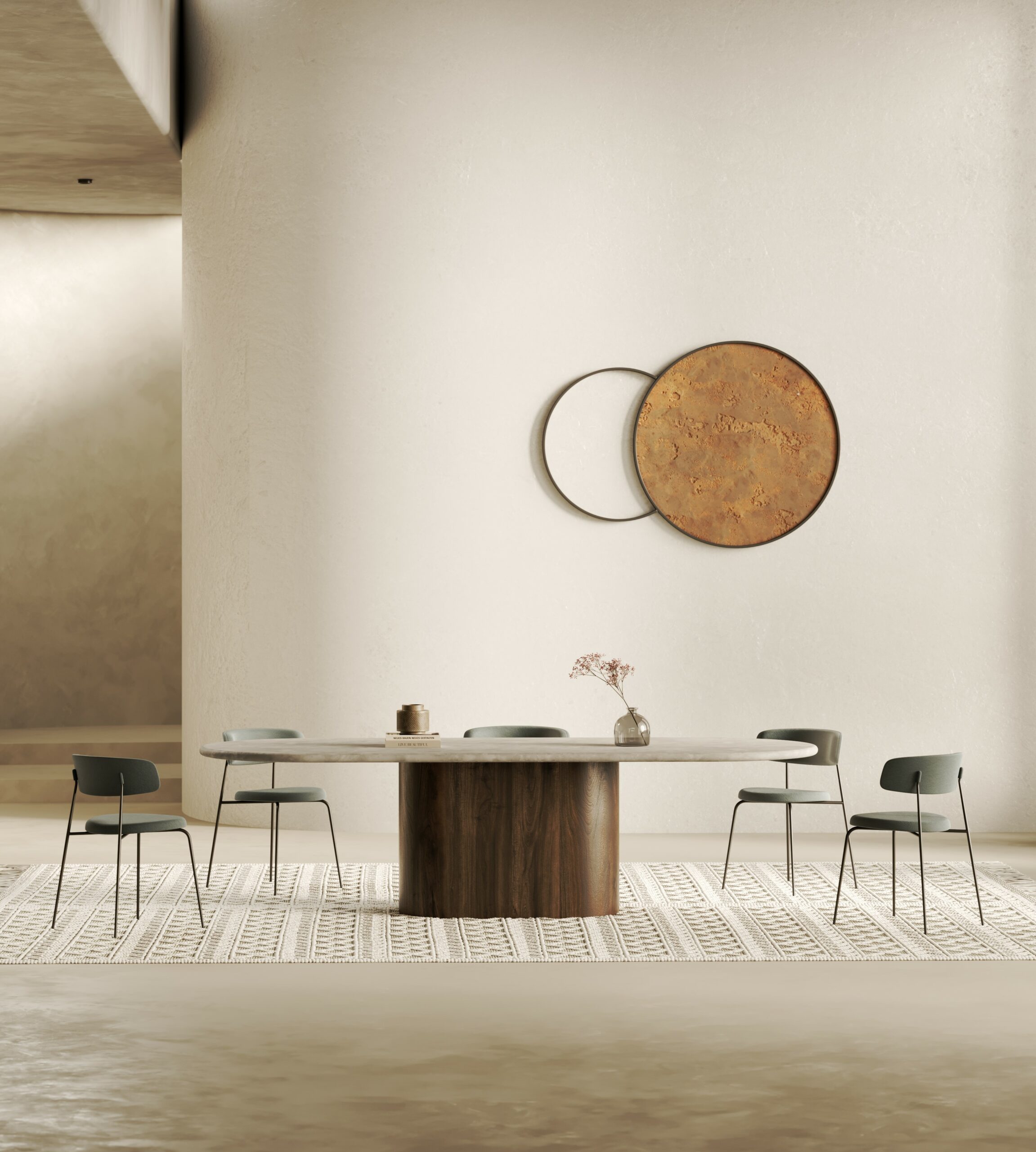 Palermo se distingue par son pied central en bois aux courbes douces, alliant solidité et légèreté visuelle. La table offre ainsi un équilibre parfait entre esthétique et fonctionnalité.