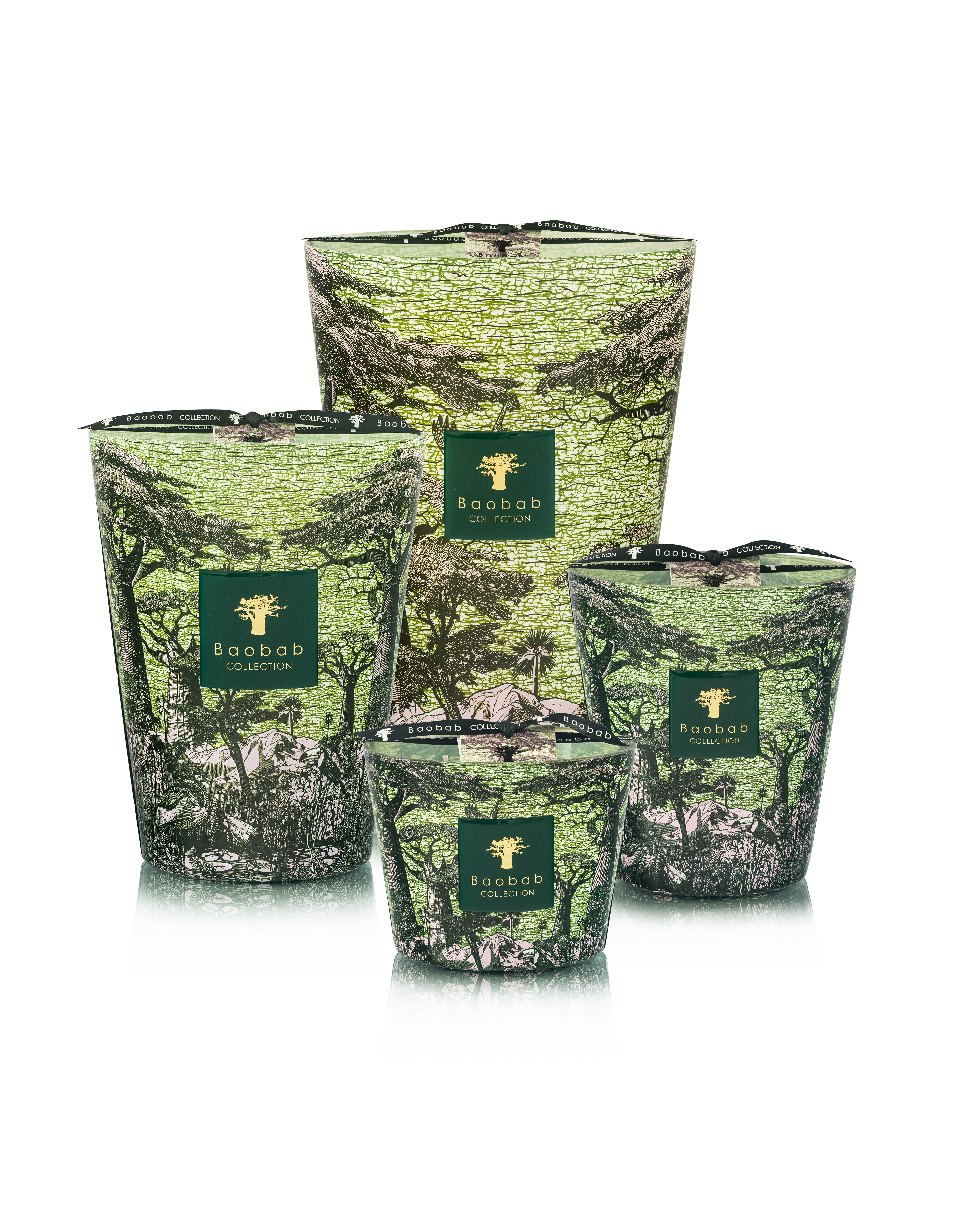 Le dessin de baobabs, créé par les artistes de la société d’impression de tissus wax Uniwax, a été recolorié dans des tons de vert profond et de lilas gris. Ce dessin figuratif laisse s’épanouir une forêt de baobabs luxuriants, où faune et flore s’épanouissent en harmonie.